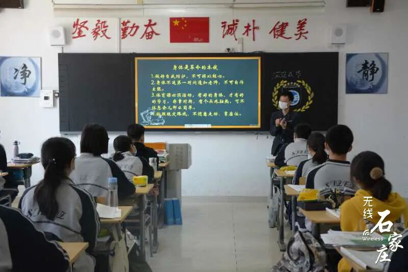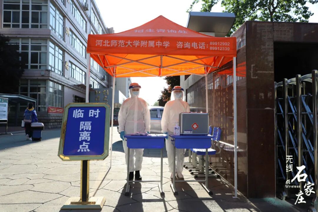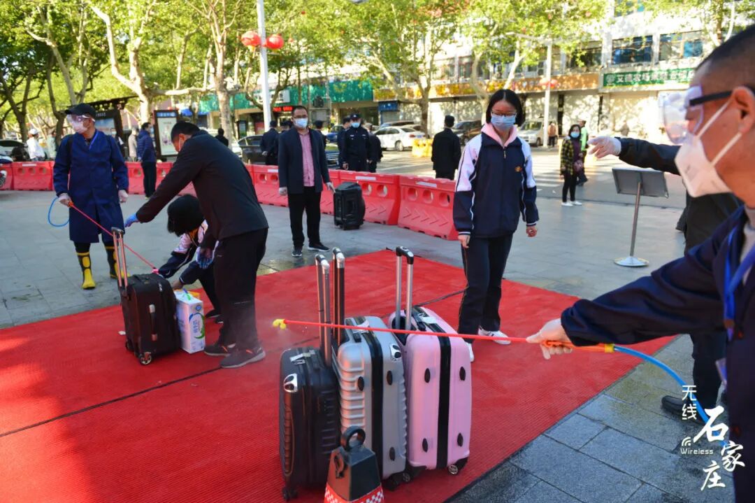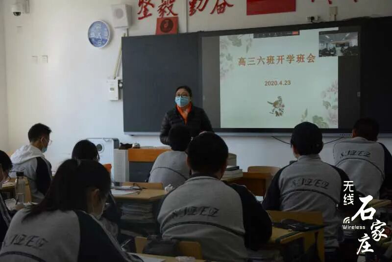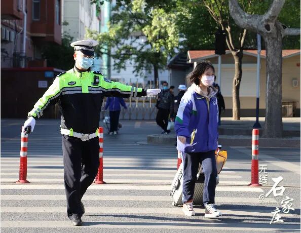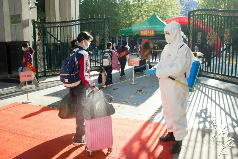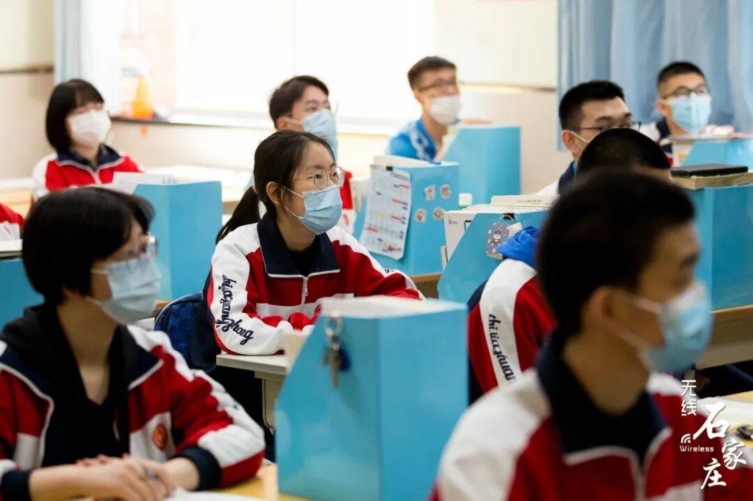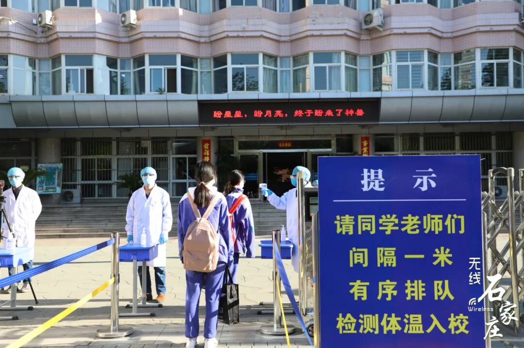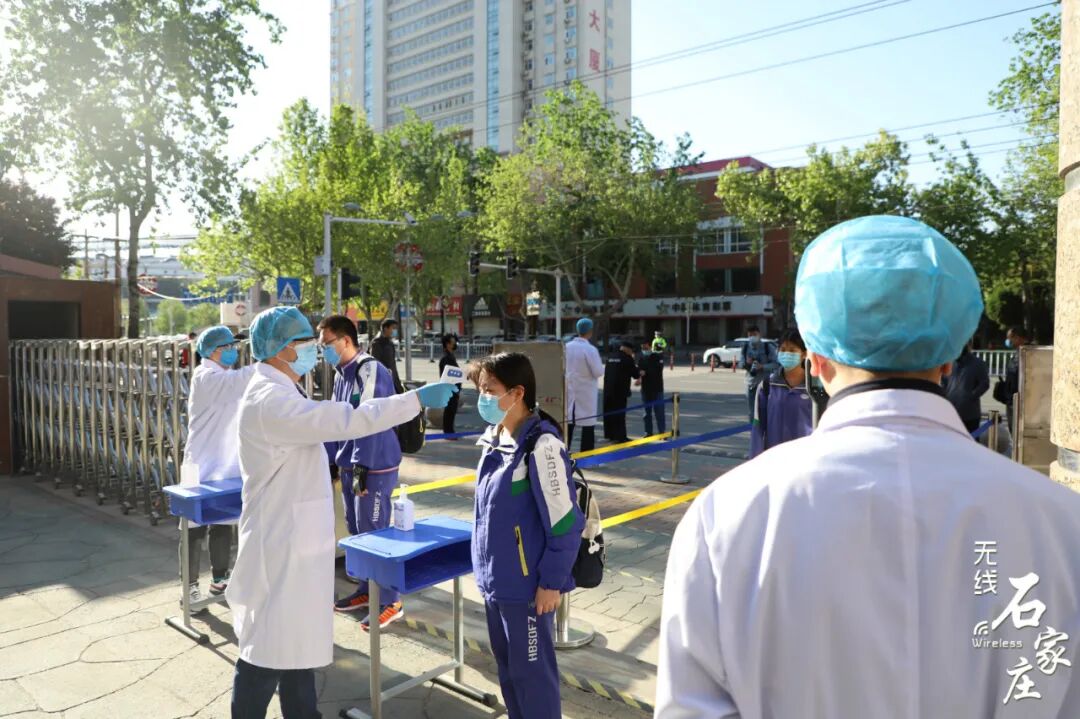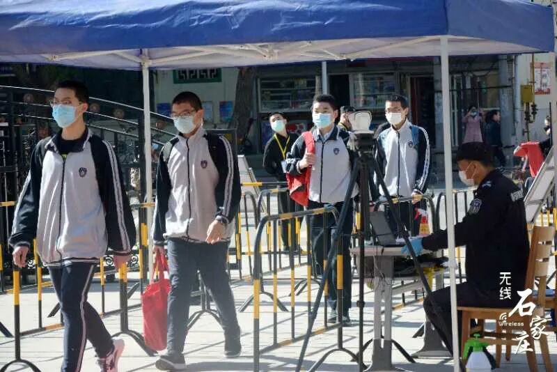 石家庄二中高三学子们佩戴口罩保持安全距离逐一走进学校教室内单人单桌,保持安全距离老师召开班会,讲解防护知识河北师大附中校门口交警在维持交通秩序同学们保持安全距离排队测温后进入学校发现体温异常的学生会被带到校门口设置的隔离点石家庄外国语学校学生经过消毒通道安全有序进入校园课堂上的学生们书桌和书桌之间保持安全距离老师再次进行严格的消杀