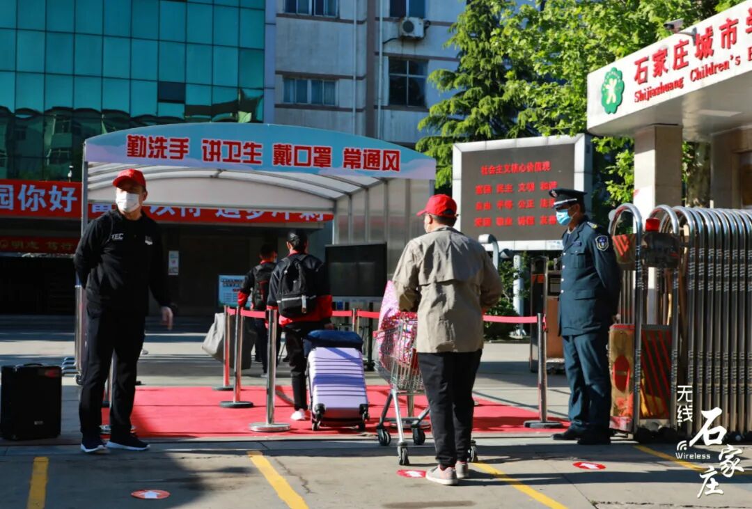 石家庄二十七中学生们排队逐个进入校园执勤的安保叔叔们也在提醒同学们保持一米以上安全的行走距离入校进行体温检测