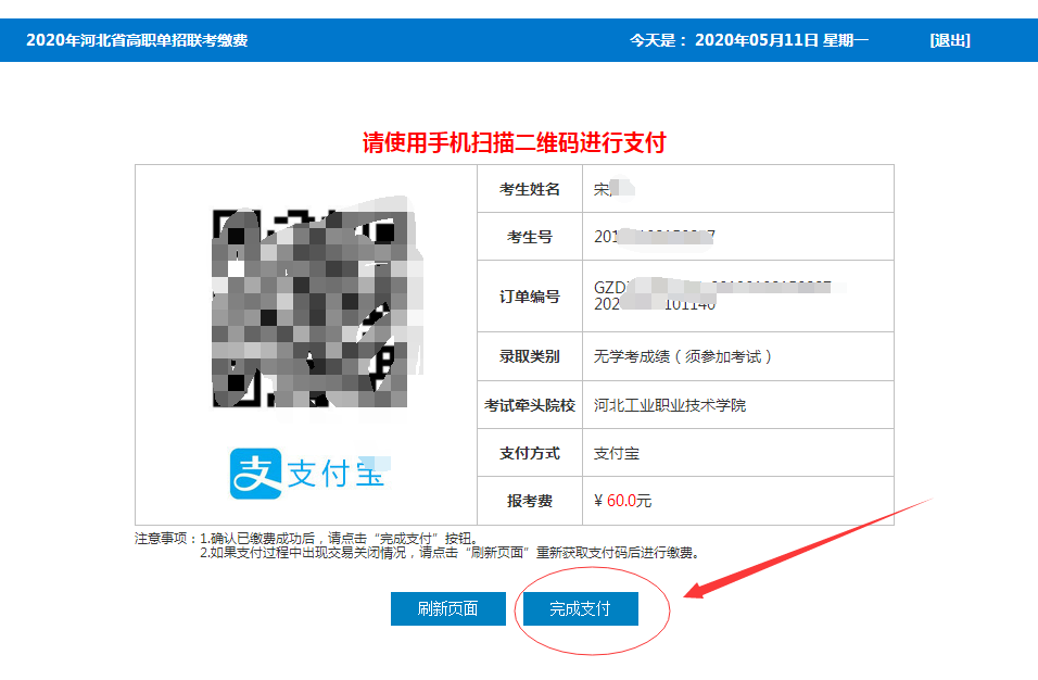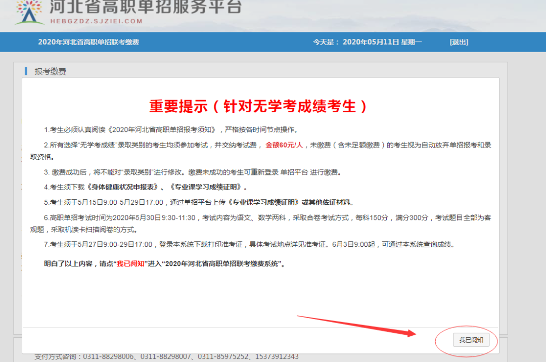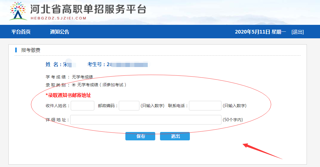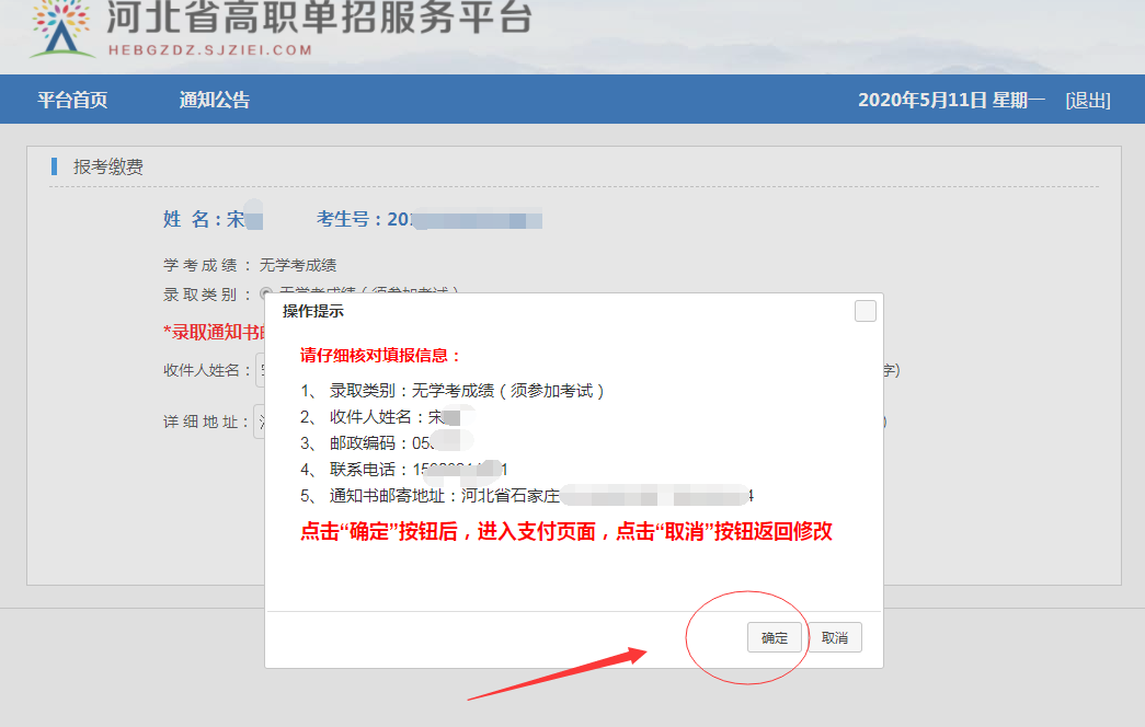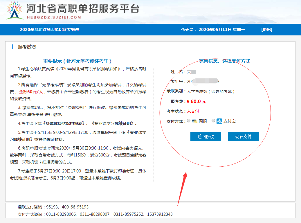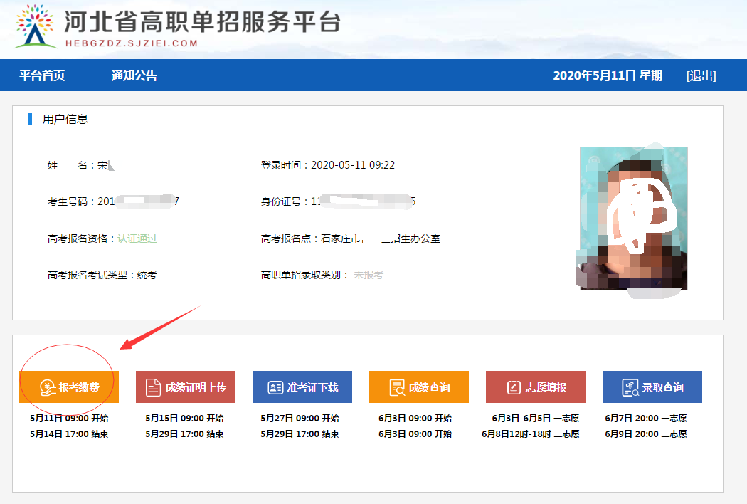 5.考生信息(本文以无学考成绩学生为例),点击左下角的报考缴费