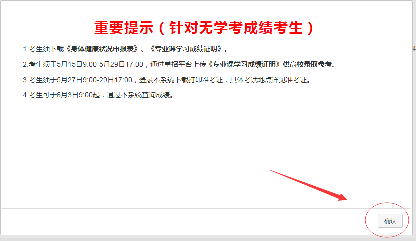 13.(针对无学考成绩考生)考生须下载《身体健康状况申报表》、《专业课学习成绩证明》。下载完成后点击退出,完成单招报名