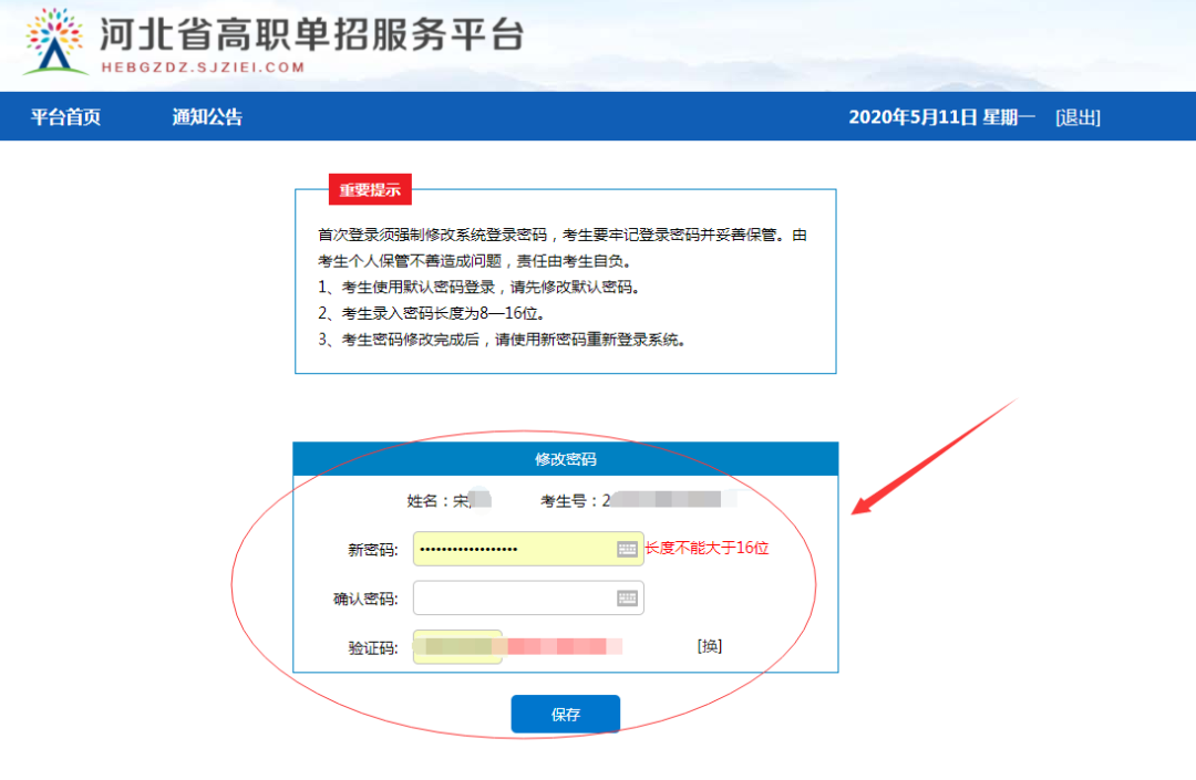 2.首次登录须强制修改系统登录密码,考生要牢记登录密码并妥善保管。由考生个人保管不善造成问题,责任由考生自负。考生使用默认密码登录,请先修改默认密码。考生录入密码长度为8—16位。考生密码修改完成后,请使用新密码重新登录系统。