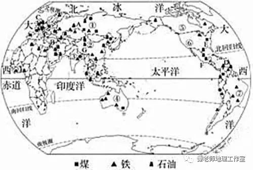 亚非北南美,南极欧大洋。 2、世界主要矿产资源: 世界重要三矿产,煤铁石油是重点。 俄巴中澳印加美,七国铁矿储量大。 亚欧大陆和北美,煤矿分布也不差。 石油分布很集中,一半以上在中东。